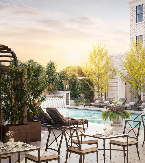 Take a moment to explore the gallery, where each image offers a glimpse into a life elevated by design and service. Whether you’re preparing dinner in your spacious kitchen, enjoying an afternoon by the serene courtyard pool, or beginning your day with a peaceful workout in the fitness center, The Galatyn offers a lifestyle defined by ease, elegance, and thoughtful detail — from sunrise to sunset.